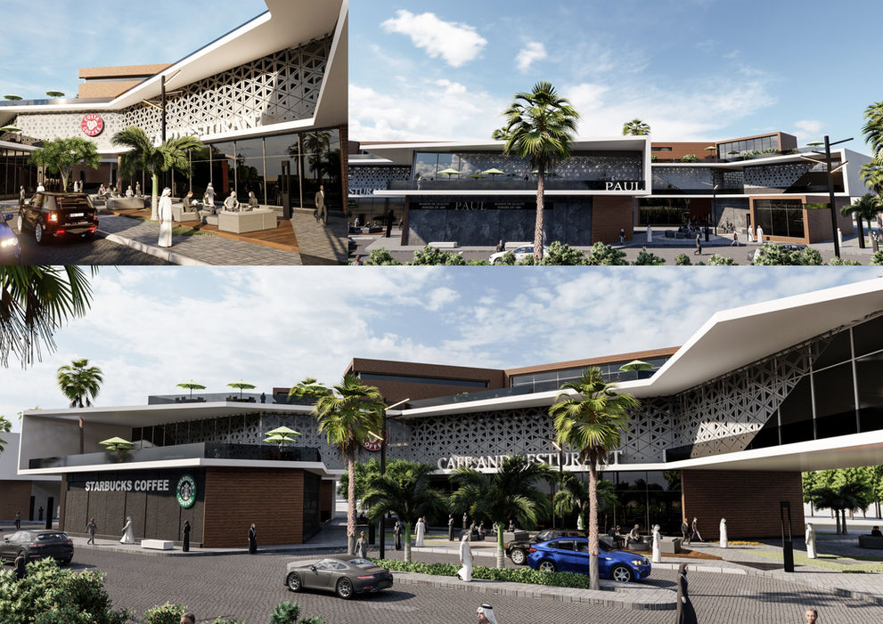 This commercial city project on Anas Bin Malek Road in Riyadh features a strip mall, offices, event halls, a hotel, and a commercial plaza. The linear design aligns with the lively nature of the street, maximizing visibility and accessibility. A central pedestrian axis provides visual and physical connectivity between all parts, creating a cohesive and dynamic urban space that fosters interaction and movement.